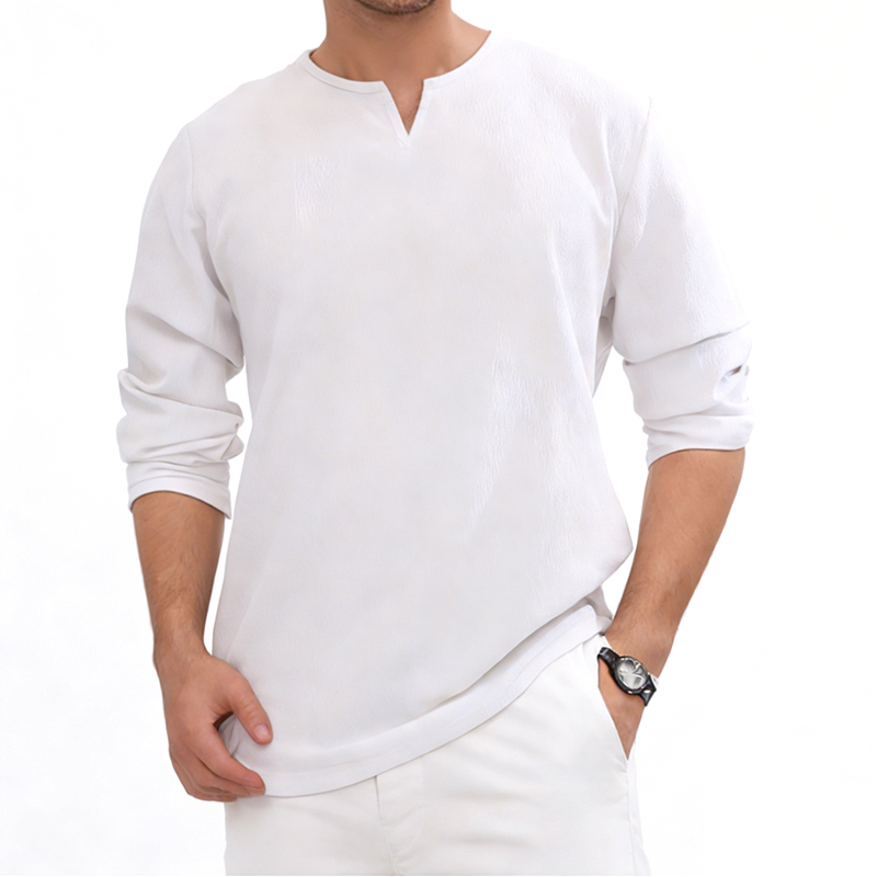 - 户外防晒透气:长袖设计可遮挡手臂,避免紫外线灼伤,比短袖更适合长时间户外活动(如逛街、通勤、海岛游玩);V 领开口比高领、圆领更透气,减少颈部闷热感,搭配棉麻、天丝等轻薄面料,吸汗速干不黏身。