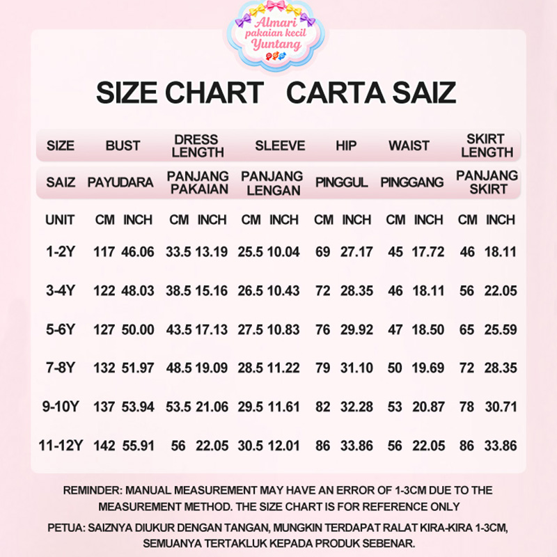 尺码:1-12Y